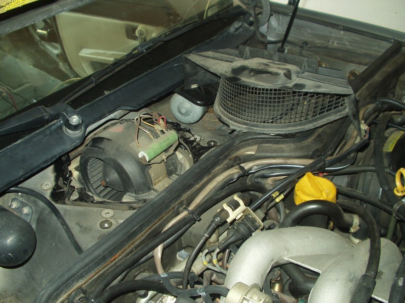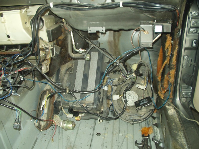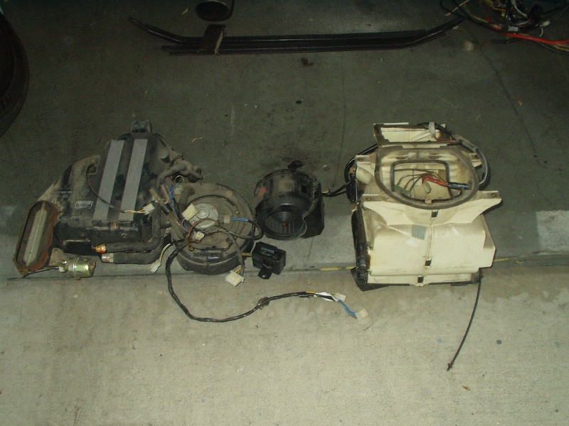 Next came the blower, heater core and misc AC components. This has been a long time coming and I was really tired of looking at the mess. I started with the easiest section, the right side and removed every bolt I could find. Removing the AC lines was cake, since the system was not charged when I bought the car; some oil from the initial charge still remained though. The center section of the dash is a little trickier--the heater core and ducting are crammed in pretty tight, but after a few minutes of yanking and screaming (get your mind out of the gutter...) the core was separated from the coolant lines and the whole mess was removed.