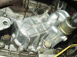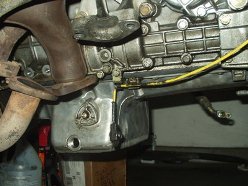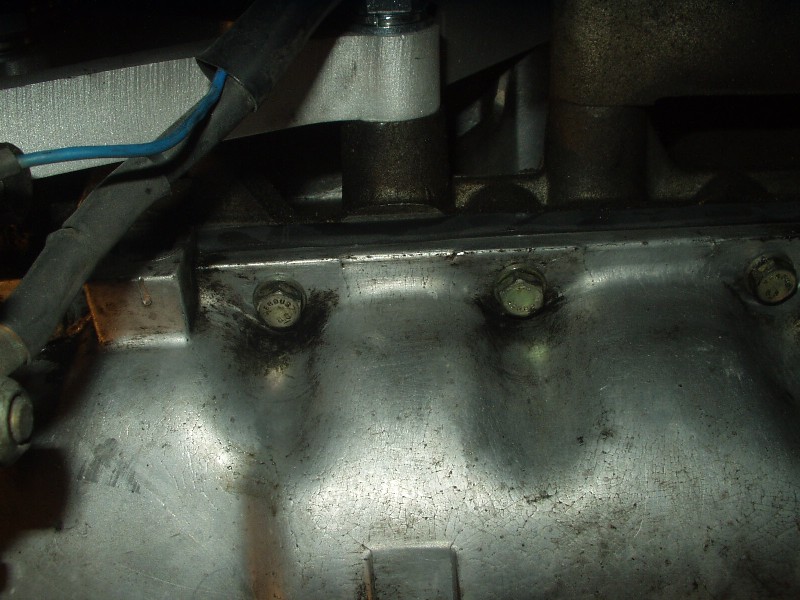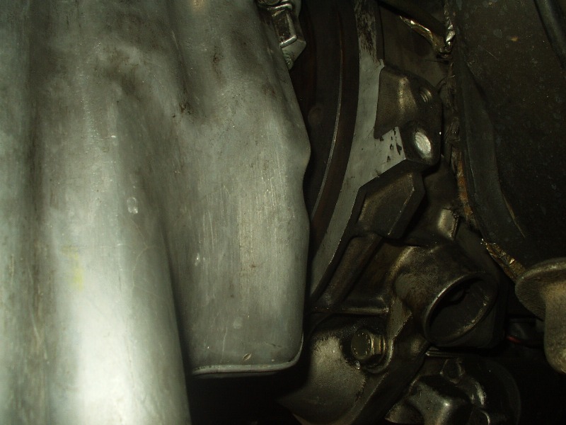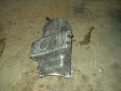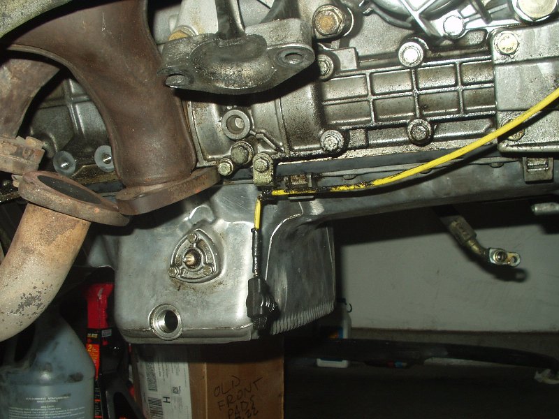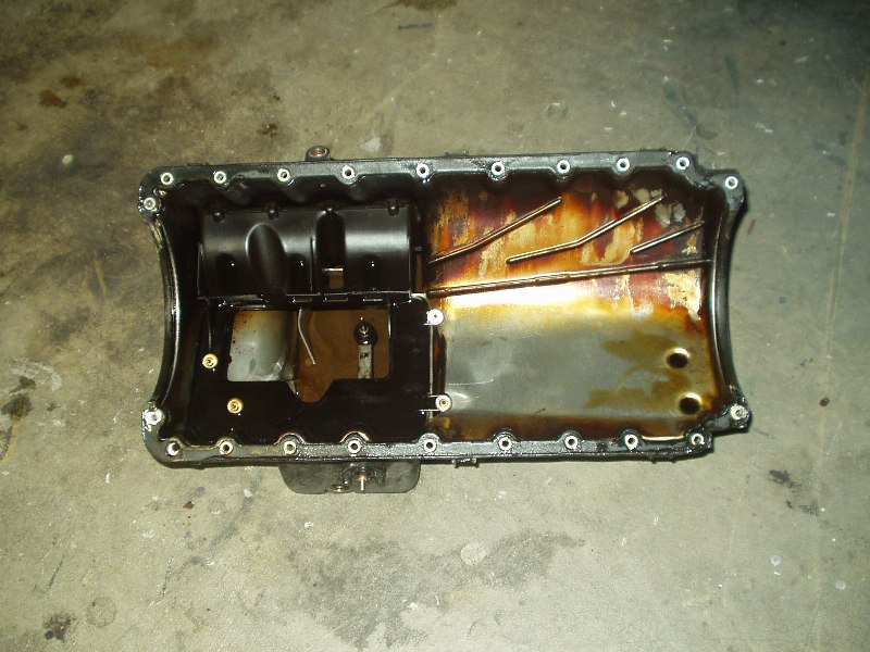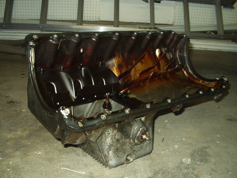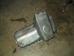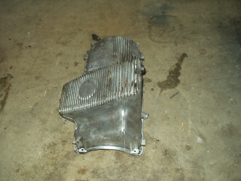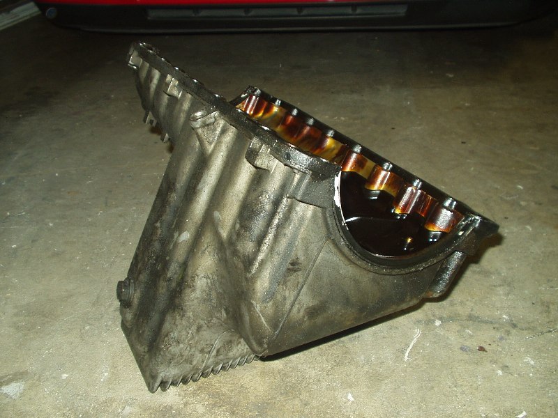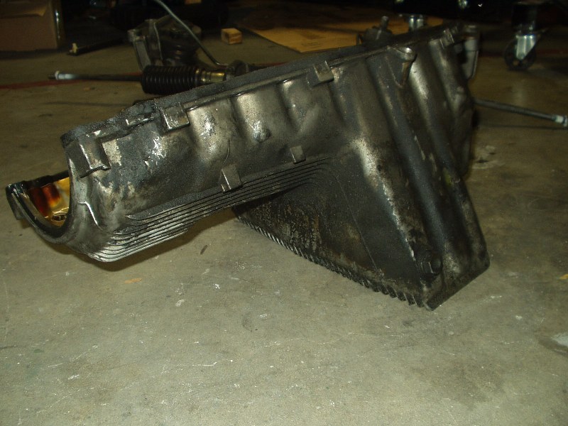 Obviously this car has leaked oil for some time. Now that the oil pan is exposed, it was easy to get in there and see how to remove it. 22 bolts later and off she came. I guess I should elaborate on that. With the oil pan unbolted, the damn thing wouldn't budge. I wiggled for a minute and it finally broke free. Cool, I thought. I wiggled some more and got hung up on the oil pickup tube. No biggie, I thought, this was mentioned in the procedure and I knew not to force it. After 10 minutes of trying to get the damn thing off, I called Joe Paluch, who was nice enough to talk me through it. A few minutes later, the dirty SOB was in my hands and free from the clutches of the equally dirty engine.