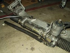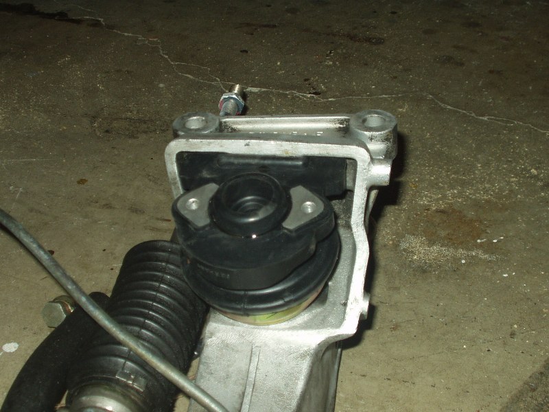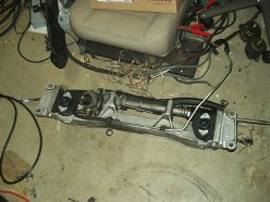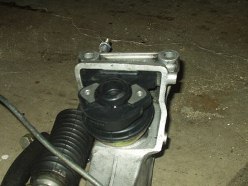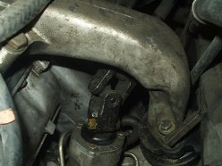 Okay, so now onto the really sketchy part of the operation. I didn't have any help around, as usual, so I lined up the crossmember and engine mounts on a jack and wobbled the whole assembly into place without losing the whole damn thing. I don't recommended this be done alone. I could have easily dropped it, cracked the crossmember or steering rack. Everybody gets there thrills in different ways, huh? Of course the engine mounts didn't line up with their holes; what a shock. The C-clamp came in very handy here as well. I smashed those bastards into place and mounted them up; then I installed the crossmember bolts and sighed a huge breath of relief. Now the engine is supported and the only big PITA left is the steering shaft. The procedure said to paint or mark the orientation, but good luck getting all that to line up again perfectly; I voted to just realign the steering wheel.