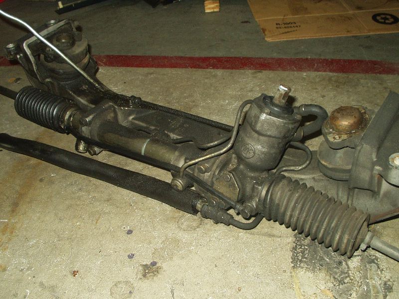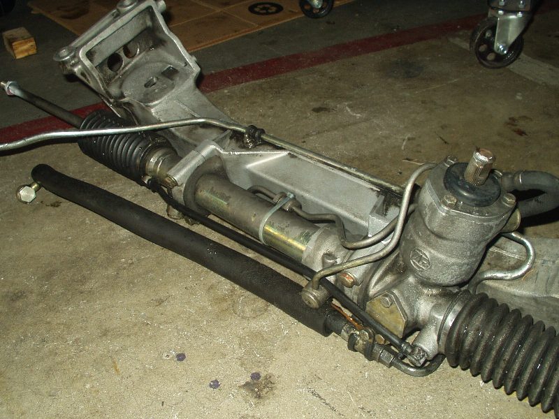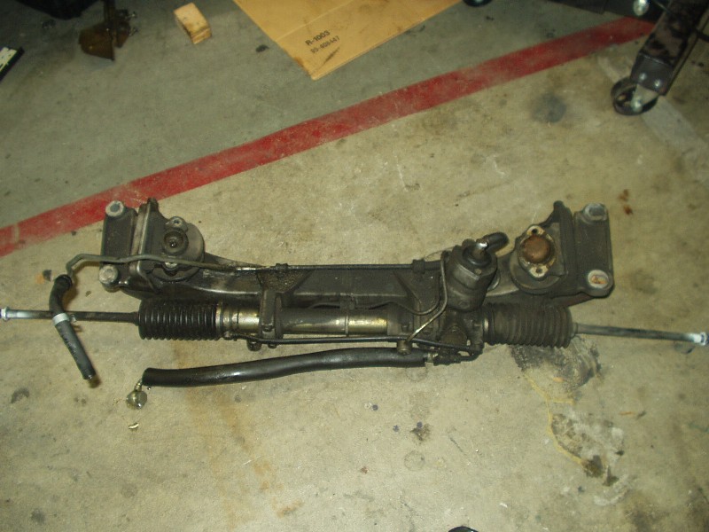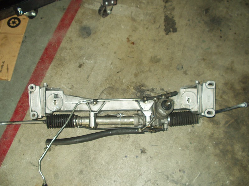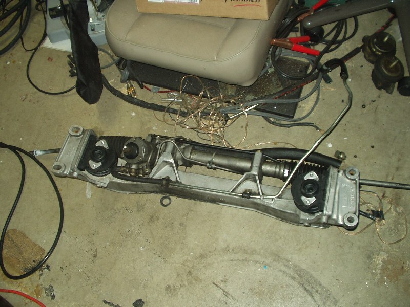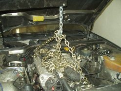As ugly as that mess of chain looks, it worked well. Next came the crossmember. Thankfully I already removed most of the suspension and front end, so this was very easy to get to. Motor mounts got disconnected from the engine and a jack went under the crossmember. Now is a good time to disconnect the power steering rack, since that is the one piece that didn't leak when I drove it home! An impact wrench made short work of the 4 big bolts holding the crossmember to the chassis.