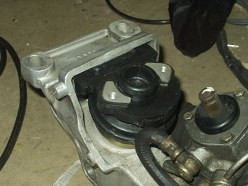 I removed the engine mounts to clean the crossmember, and was surprised to find that one was completely torn in two pieces. I'm not an expert, but I'm pretty sure that's bad. I ordered new OEM mounts off eBay for $80, and they actually looked to be authentic; even if they aren't, it's too damn late now. A large C-clamp made installing them in the crossmember very easy.